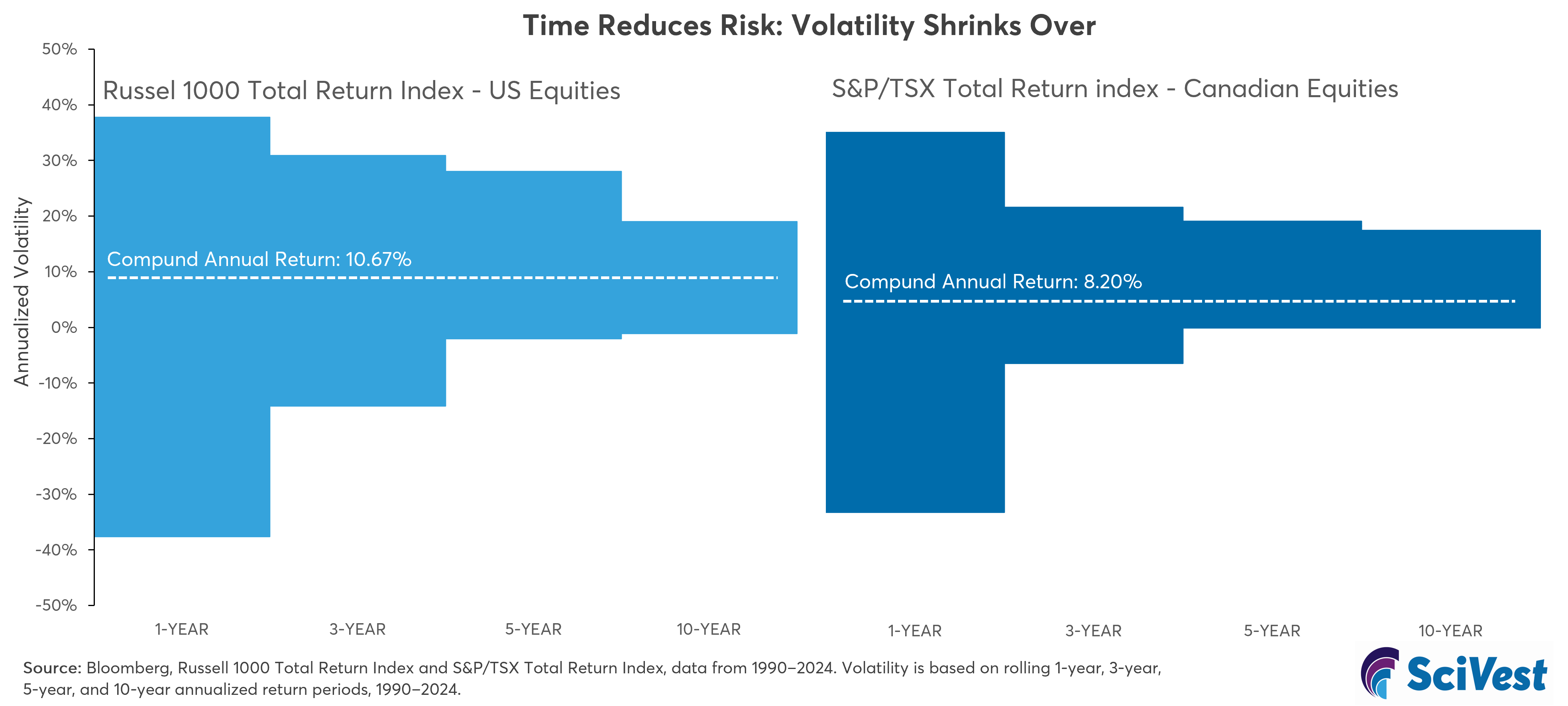We conducted a case study using rolling annualized returns of the S&P/TSX Total Return Composite from 1980 to 2024 to test a simple question: does time really tilt the odds in favour of disciplined investors? The results are clear: while one-year returns swung violently, longer horizons tell a different story. Over 5 and 10-year periods, outcomes consistently clustered around positive averages, even when those high-volatility events were included.